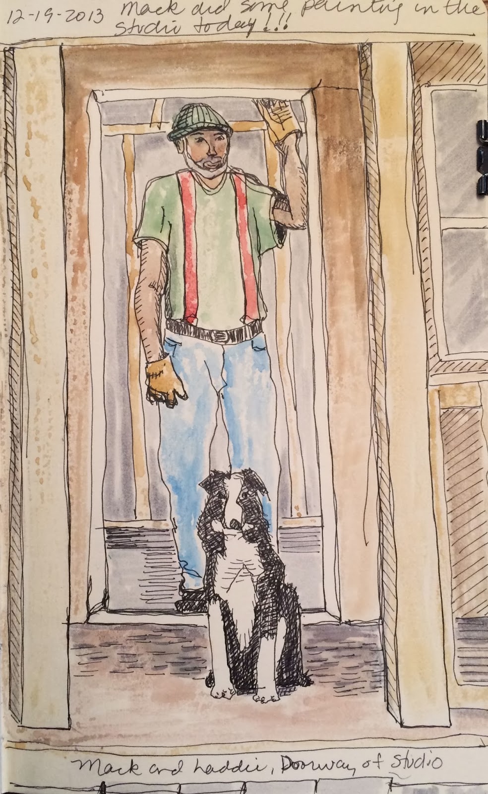 Here is a sketch of Mack and Josh putting up walls in the new studio we have been working on and another of Josh taking a well earned break.  This was drawn with an oil based pencil with some colored pencil accents and the one of Mack and Josh is with the super fine carbon ink fountain pen.